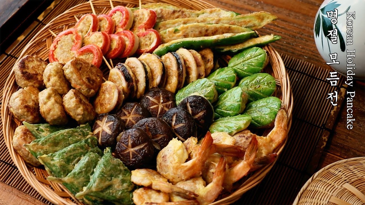 전: Deliciously savory pan-fried pancakes. They come in many varieties, from kimchi-filled ones to those made with fish, shrimp, or zucchini dipped in an egg batter.
