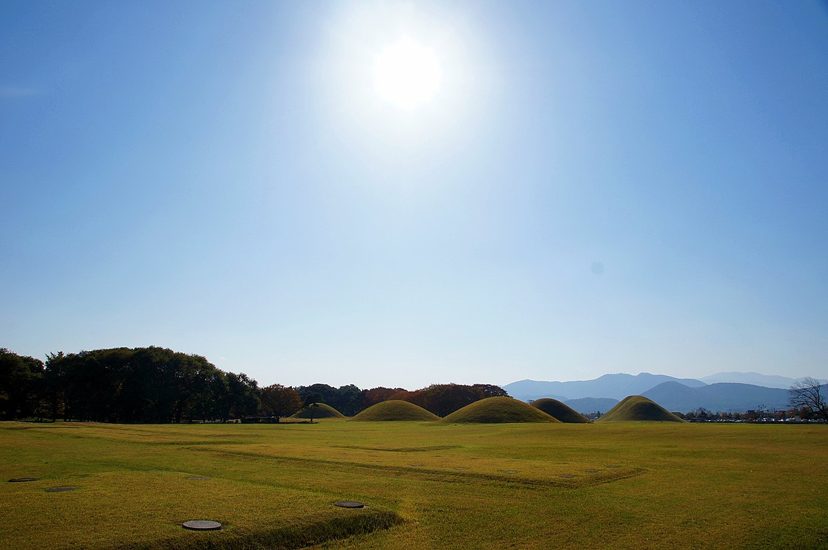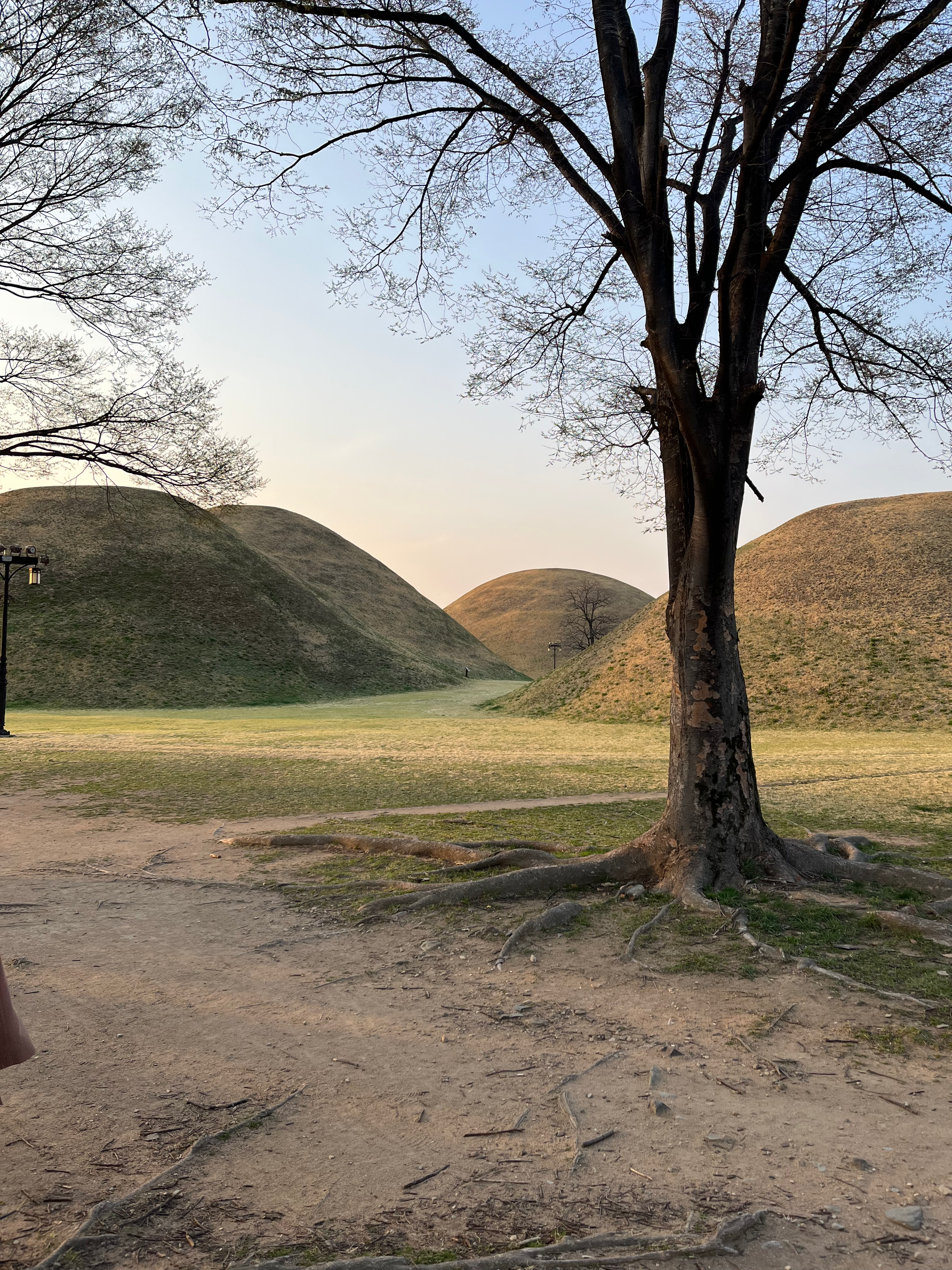 경주 is an old city that was previously the capital of the 신라 dynasty (57 BC – 935 AD). It is home to many 유네스코 (UNESCO) 세계유산 (세계 (world) + 유산 (heritage)) sites! Some of the most famous things in 경주 are the 오릉 (five tombs). These are massive hills that are to honor dead royalty!