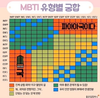 Yes, that's right—a full 16x16 grid showing every possible match! The colors show their chemistry, ranging from the absolute worst in orange (궁합최악) all the way up to a match made in heaven in blue (천생연분).